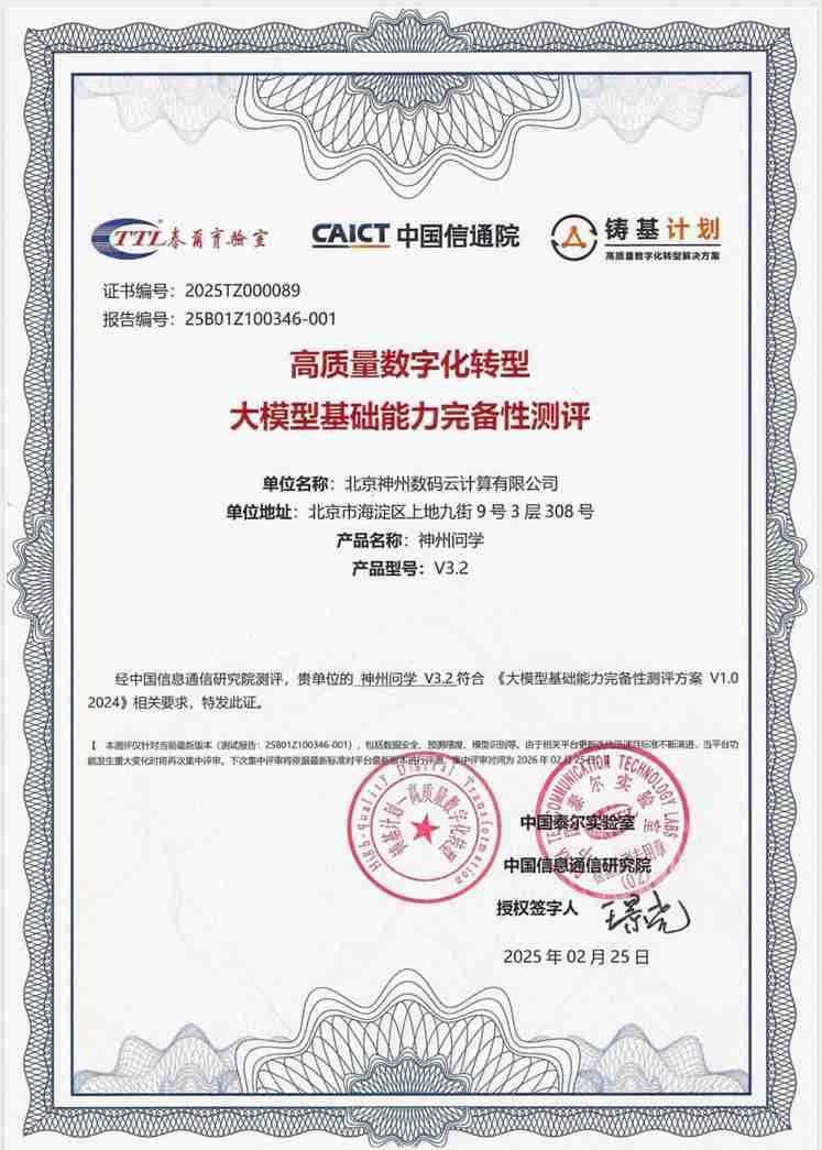 近日,,,55世纪数码旗下AI原生赋能平台55世纪问学正式通过中国信息通信研究院(以下简称中国信通院)大模型基础能力完备性测评,,,成为国内首批通过该项权威认证的企业级大模型解决方案。。。此次测评历时三个月,,,,覆盖数据安全、、性能、、、效率三大核心模块,,,标志着55世纪数码在大模型技术底座构建领域的技术能力更进一步,,,为千行百业智能化转型注入可信技术动能。。。